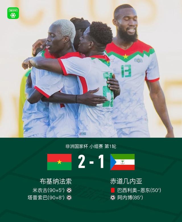 北京时间12月24日,非洲国家杯小组赛首轮,布基纳法索对阵赤道几内亚。恩东被赤道几内亚队红牌罚下。第85分钟,在少一人的情况下,赤道几内亚队由阿内博攻入首球。第95分钟和第98分钟,米农古进球扳平比分,塔普索巴获胜。最终布基纳法索2-1逆转战胜赤道几内亚。集锦 第50分钟,赤道几内亚队巴西利奥·恩东吃到红牌。第85分钟,赤道几内亚球员阿卡波助攻阿内博进球。下半场补时第5分钟,布基纳法索球员丹戈·瓦塔拉助攻米农古进球。下半场补时第8分钟,布基纳法索球员塔普索巴头球破门致胜。 Kopo阵容技术统计然后