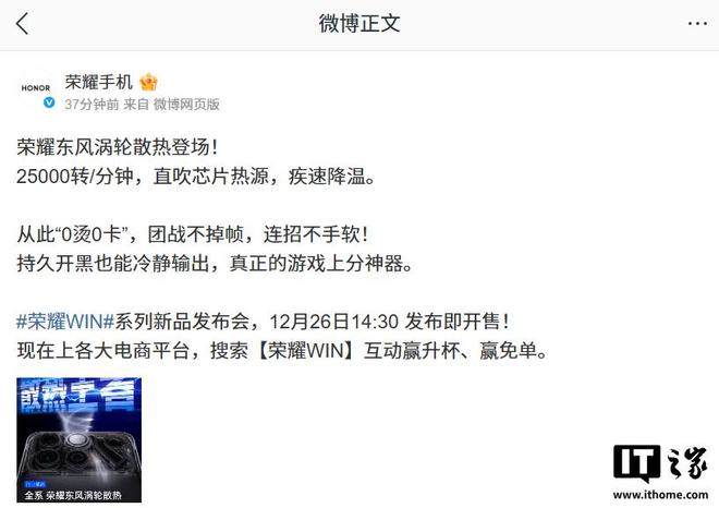 荣耀WIN系列新品全系搭载“荣耀东风涡轮散热”:25000转