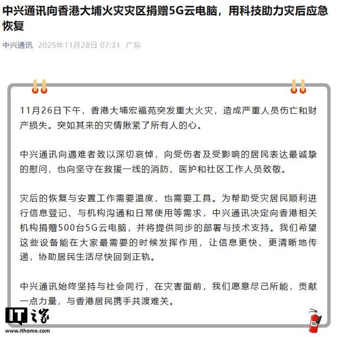 IT之家11月28日报道,11月26日下午,香港大埔宏福苑发生重大火灾,造成严重人员伤亡和财产损失。中兴通讯今天宣布,将向香港相关机构提供500台5G云电脑,并提供同步部署和技术支持。附原文如下: 11月26日下午,香港大埔宏福苑发生重大火灾,造成严重人员伤亡和财产损失。突如其来的灾难,牵动着所有人的心。中兴通讯向遇难者表示最沉痛的哀悼,向受伤和受灾居民表示最诚挚的慰问,向坚守在救援第一线的消防人员、医务人员和社区工作者致以崇高的敬意。灾后恢复安置工作既需要温度,也需要工具。为帮助受影响居民正确登记信息,社区为了配合机构、日常使用,中兴通讯决定向香港相关机构提供500台5G云电脑,并提供同步部署和技术支持。我们希望这些设备能够在大家需要的时候发挥作用,让信息能够更快、更清晰地传递,帮助居民早日恢复正常生活。中兴通讯始终坚持与社会同行。面对灾难,我们愿意尽自己的一份力量,贡献一点绵薄之力,与香港市民一起共克时艰。