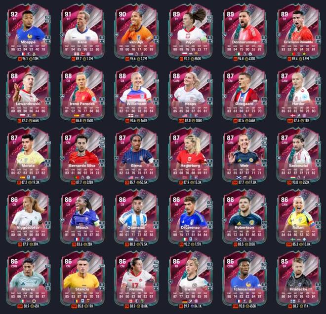 EA 在今晚早些时候推出了足球庆祝活动。其中,姆巴佩带队,C罗、凯恩、范迪克也在其中。这套卡牌将额外获得两点国化学加成。完整名单 姆巴佩 - 92 哈里·凯恩 - 91 范戴克 - 90 帕约尔 - 89 多纳鲁马 - 89 克里斯蒂亚诺·罗纳尔多 - 89 莱万多夫斯基 - 88 艾琳·帕雷德斯 - 88 利亚·威廉森 - 88 林赛·霍兰 - 88 厄德高 - 87 佩尼·哈德 - 87 莫拉塔 - 87 贝尔纳多·席尔瓦 - 87 吉尔马- 87 赫格伯格 - 87 韦尔 - 87 索博斯莱 - 87 维吉尔多蒂尔 - 86 姆博克 - 86 奥塔门迪 - 86 迪洛伦佐 - 86 罗伯逊 - 86 阿斯拉尼 - 86 埃德森阿尔瓦雷斯 - 86 斯坦丘 - 86 杰西·弗莱明 - 86 格温 - 86 查梅尼 - 86 赫拉德茨基 - 85奥斯卡 - 8 85 内森·柯林斯 - 85 泽林斯基 - 85 雷姆 - 85 乔丹·阿尤 - 85 亨德森 - 85 霍伊别尔格 - 85 斯皮策 - 85 科梅蒂 - 85 多洛雷斯·席尔瓦 - 84 休姆 - 84 本·戴维斯 - 84 [在 Migu 独家观看英超联赛]