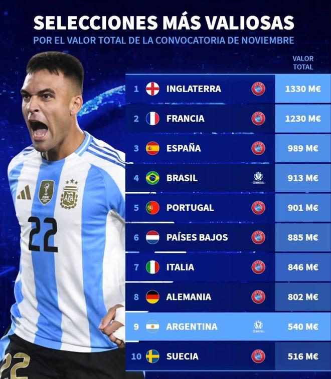 北京时间11月15日,德专统计了本月国际比赛日国家队身价前10名的球队。英格兰以超过13.3亿欧元排名第一,法国以12.3亿欧元排名第二,西班牙以9.89亿欧元排名第三,阿根廷以5.4亿欧元排名第九。根据德国转会统计,本月国际比赛日国家队身价前10名:1.英格兰13.3亿欧元2.法国12.3亿欧元3.西班牙9.89亿欧元4.巴西9.13亿欧元5.葡萄牙9.01亿欧元6.荷兰8.85亿欧元7.意大利8.46亿欧元8.德国8.02亿欧元9.欧元10.瑞典 5.16亿欧元【咪咕独家观看英超】