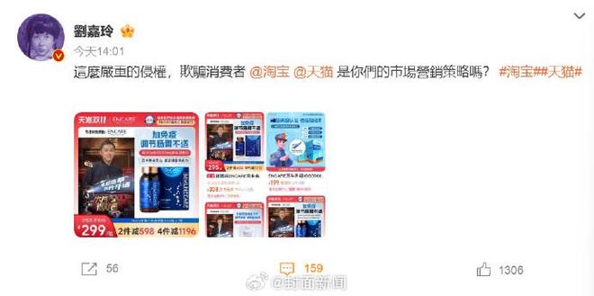 11月10日,@李佳颖质疑淘宝、天猫平台,称其允许不符合梁朝伟照片的商家进行虚假宣传,涉嫌严重违规、欺骗消费者。涉案产品为天猫国际“encare海外旗舰店”销售的保健品。页面使用@梁超伟的照片,表明他是代言人,但梁朝伟从未与该品牌有过合作。刘嘉玲愤怒地写道:“如此严重侵犯和欺骗消费者,这就是你们的营销策略吗?”以及@淘宝和天猫官方账号。刘嘉玲微博截图
