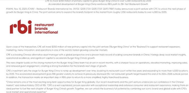 文丨少女方方,身披铠甲,星巴克将60%中国业务卖给本土投资者后不久,汉堡王中国也找到了“新舵手”。结合麦当劳早前出售中国控制权,不难看出外资餐厅在华的经营经历已经彻底改变……在星巴克将60%的中国业务出售给本土投资者后不久,汉堡王中国也找到了“新舵手”。 11月10日,RBI集团(汉堡王、Tim Hortons、Popeyes的母公司)与CPE元丰宣布,将成立一家名为汉堡王中国的合资公司。 CPE元丰将持有约83%的股权,而RBI将仅象征性地保留17%。该交易预计将于明年初完成。 ▲CPE元丰与汉堡王的协议/来源:RBI官网 2005年,汉堡王以“火烤汉堡”亮相,一度让人眼前一亮p。不幸的是,扩张的步伐不够快,声誉和关注度没有赶上竞争对手。长期以来,处于“无人指责、无人赞扬”的尴尬境地。今年年初,RBI觉得“实在受不了了”,决定亲自接管汉堡王中国业务,并开始寻找新的“联姻对象”。结合此前麦当劳在华控制权的出售,不难看出外资餐厅在华推出了“本土合作伙伴招募计划”。 1./汉堡王中国“推销自己”:从“慢王”到“重启模式”/2005年,汉堡王顶着全球“第二大汉堡巨头”的光环来到中国。第一家店选在上海静安寺的一栋小洋楼里。装修风格西式,色调高端,气场十足。当时,它的想法很简单——与麦当劳不同,肯德基。所以我们坚持直营,不搞特许经营。菜单照搬了美国版,价格比其他的贵了几块钱。它很时尚,但问题是中国消费者还没有准备好为“火烤”汉堡支付更多费用。 ▲汉堡王在华首店/图源:汉堡王官网 近七年来,汉堡王在全国仅开设了52家门店,比肯德基一个季度开设的门店数量还少。麦肯和M已经在全国开设了cCann门店,但还在犹豫如何入局。最后,汉堡王意识到问题不在于产品,而在于不知道如何应对中国市场。 2012年,母公司RBI索性挣脱束缚,将中国业务打包交给土耳其加盟商TFI,退居幕后。当 TFI 接管后,课程发生了 180 度大转弯。上一张也太慢,所以我会跑得更快。短短几年时间,依靠特许经营模式,门店数量从50多家增加到1500家,看上去蒸蒸日上。但一旦失去速度,问题就开始了。加盟门槛低,管理无法维持,供应链和质量控制全面严密,部分店面存在使用过期物质的情况,店内氛围也不平等。更糟糕的是,TFI 对中国市场几乎一无所知。汉堡王在中国开设第1500家店/来源:百度青春玩《疯狂星期四》,麦当劳、肯德基迅速跟进,但汉堡王完全没有反应;全部参与国潮联名,宣扬情感价值,依然卖“美国经典”;对于小红书和抖音的流量方式更是一头雾水。结果,品牌变得越来越边缘化,消费者变得越来越冷漠。编号门店数量从1500家下降到1300家,同店销售额同比下降,加盟商抱怨不断。 2024年初,印度储备银行终于忍无可忍,花费1.58亿美元恢复了全部股权。天开的中国梦结束了。 ▲ RBI 2024年全球区域表现/来源:RBI官方网站 此时,RBI并没有在国外寻找收购,而是选择亲自“管理”。 8个月的时间,它首先进行了一轮“实体审查”,关闭了近200家低效门店,将资源回归一二线城市的主要商圈,并重组了管理。此次新团队全部是中国高管:副CEO陈文睿是百胜系列的资深人士,首席创新官薛丙丹是前麦当劳中国新营销增长副总裁。也就是说,这一次是由真正了解中国市场的人来领导的。新团队并不急于推出新产品产品方面,ngunit首先打下了基础——专注于运营、供应链管理、提升服务体验。事实证明,速度越慢,路径越稳定。 2025年第三季度,汉堡王中国同店销售额猛增10.5%,用更少的门店赚更多的钱,品牌地位明显恢复。这次反弹也让投资者放心了。 CPE元丰以25亿元人民币(约合3.5亿美元)真金白银入市。它不仅获得了汉堡王未来20年的独家开发权,还为该连锁消费品牌带来了一整套的实践经验。说白了,就是“本土资本+本土团队”让汉堡王再次“中国味道”。携策划王党将汉堡王在中国市场的门店规模从目前的约1250家扩大到2035年的4000多家。从高调入场,到迷失道路,回到路上,汉堡王在中国已经奋斗了二十年。此时,终于决定“真正回归”地面。我们能东山再起吗?没有人敢保证。但至少现在,情况正在变得严重。 ▲ CPE元丰与汉堡王的协议/来源:RBI官网2./资本的终结,汉堡王请来“中国大厨”/拿下汉堡王中国83%控股权,母公司RBI准备退出“小股东”地位。 CPE元丰显然不是一个普通的“金融家之父”,而是一个隐藏在资本市场的“消费赛道操盘手”。这个组织一向低调,却几乎参与了中国消费升级的每一个重要节点。我们先来看看它的“家庭背景”。 CPE元丰前身为中信产业基金,成立于2008年,第一大股东为中信证券(持股35%)。今天,管理资产规模超过1500亿元,投资企业超过300家,其中仅消费服务业投资就超过100亿元。这个名字或许没有红杉、高瓴那么响亮,但你一定听说过它投资的企业——蜜雪冰城、泡泡玛特、宁德时代、老铺黄金,还有永和植发、丝兰护发、美丽田园……从餐饮到美容。健康几乎是中国人“吃、穿、住、行、美”的方方面面。 ▲ CPE元丰投资的部分企业/来源:天眼查 但CPE元丰真正独特之处在于,它并不投入巨资,而是“深度管理”。这不是那种投资了就走的金融投资者,而是一种“以个人投资结束”的资本类型的交易。它的投资逻辑很明确:要么不投资,要么投资了,就必须深度参与企业运营。从战略规划到建立管理,从供应链到营销策略,都需要介入。 CPE