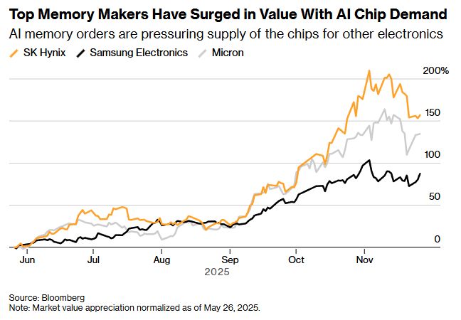 智通财经APP获悉,戴尔科技(Dell.us)、惠普(HPQ.US)等多家科技公司均发出警告,由于人工智能(AI)基础设施建设带来的需求激增,明年可能出现内存供应短缺的情况。包括小米集团在内的消费电子制造商已警告可能出现价格上涨,而联想集团等公司已开始储备存储芯片,以应对预期的成本上涨。市场研究公司Counterpoint Research本月预测,明年第二季度内存模块价格将上涨50%。存储芯片的短缺可能会推高从手机到医疗设备和汽车等各种产品的制造成本。这些 inbing 芯片几乎用于所有存储数据的现代电子设备。在人工智能热潮中,存储芯片制造商正在分配更多产能,以满足对新的、更复杂和更有利可图的产品的需求人工智能系统中的内存不足,导致更常见类型的内存短缺。戴尔科技集团首席运营官杰夫·克拉克(Jeff Clarke)在周二与分析师举行的电话会议上表示,该公司从未见过“成本以现在的速度变化”。他表示,该公司的动态随机存取存储器(DRAM)——包括人工智能中使用的高带宽存储器(HBM)和个人电脑(PC)中使用的芯片——以及硬盘驱动器和所谓的NAND闪存的供应量有所减少,“所有产品的基础都在增加”。戴尔科技公司将努力调整其配置和产品组合,但克拉克表示,他相信影响将不可避免地波及到客户。他表示,这家位于德克萨斯州的计算机制造商将考虑所有选择,包括重新定价部分设备。惠普首席执行官恩里克·洛雷斯表示,该公司认为 2026 年下半年将特别具有挑战性,如有必要将提高价格。 “下半年,我们要他表示:“我们对我们的指导采取了谨慎的态度,因为我们采取了积极主动的行动,例如引入更多内存供应商并减少我们产品中的内存使用量。”该公司估计内存占典型 PC 成本的 15% 至 18%。苹果 (AAPL.US) 给出了最乐观的评估之一。首席财务官 Kevan Parekh 在与分析师的电话会议上承认,内存价格存在“轻微尾随”,并且一些“新产品的成本略高”但他强调,苹果对成本管理得很好。与联想一样,苹果作为电子产品供应链中众多厂商的最大客户之一(即使不是最大的客户),有助于确保持续供应的有利条件。存储芯片“超级周期”已经到来!供应短缺可能会持续到2026年。2022年11月ChatGPT发布并引发生成式AI热潮,以及全球AI数据建设热潮后,存储芯片制造商开始分配更多产品高带宽内存(HBM)芯片的生产能力。 Ang MGA订购NG内存和NGAI挤压其他电子产品的销售来自中国竞争对手的成熟芯片供应竞争日益激烈,也促使控制着全球DRAM芯片市场约70%的三星和SK海力士加速向高端芯片转型。这些厂商从2025年初开始就在逐步调整策略,从2025年底到2026年初逐步减少甚至计划完全停止DDR4内存颗粒的生产,并将产能完全转移到利润更高、技术更先进的DDR5、HBM等产品上。摩根士丹利预计,包括谷歌、亚马逊、Meta、微软和Coreweave在内的科技巨头今年将投资4000亿美元用于人工智能基础设施。这场人工智能热潮恰逢传统数据中心更新换代的新周期d 个人电脑。分析师指出,这加上手机销量高于预期,加剧了非HBM存储芯片的供应不足,并推高了其价格。据悉,RAM以4GB DDR4X为例,芯片现货市场已从今年初的低位7美元/片上涨至11月中旬的30美元/片以上,涨幅达3-4倍;闪存,以64G EMMC为例,从年初的3.2美元/片涨到近期的8美元/片以上,涨幅约为1.5倍。此外,随着海外AI服务器对ESSD需求的增加,NAND闪存也开始跟随DRAM颗粒大幅涨价。在普通内存供应拥挤的同时,内存芯片行业似乎在许多分析师所说的“超级周期”中加剧,设备制造商疯狂囤积内存芯片。 Tobey Gonnerman,全球半导体分销商总裁贡献者Fusion表示:“最近一两个月需求有所增长,市场变化确实快得惊人。存储芯片价格的大幅上涨带动了三星电子、SK海力士和美光科技(MU.US)的股价近几个月大幅上涨。SK海力士上个月表示已经出售了明年的所有内存产能,而美光科技预计供应限制将持续到2026年。日本铠侠控股(Kioxia Holdings)的股票,专门从事 NAND 制造的公司自去年 12 月上市以来股价上涨数倍,中芯国际指出,在制造商优先供应 NVIDIA (NVDA.US) 的背景下,内存短缺问题正在显现。该公司警告说,内存短缺可能会限制 2026 年的汽车和电子产品生产。”里昂证券韩国证券研究主管 Sanjeev Rana 在三星电子发布财报后表示。上个月港口:“所有内存相关产品——无论是高级内存还是传统内存——的需求都非常强劲,但供应却滞后。” “我们可能会看到 DRAM 和 NAND 的价格上涨趋势将持续几个季度。”